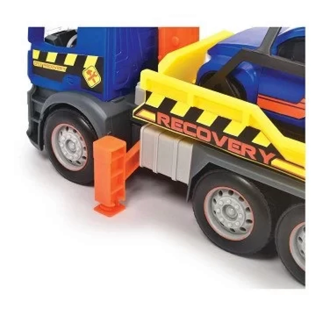 Dickie Aksiyon Araba Çekici Tır orijinal Mercedes lisanslıdır. 26cm uzunluğundadır. Oyunu daha gerçekçi kılmak için ses ve ışık fonksiyonlarına sahiptir. Dorsesinde 1 adet araba ile birlikte gelir. Üzerindeki vinç kolu ile yolda kalmış araba tırın dorsesine kolayca yüklenebilmektedir. Sürtmeli teker özelliğine sahiptir.