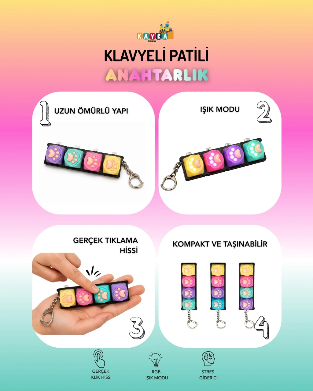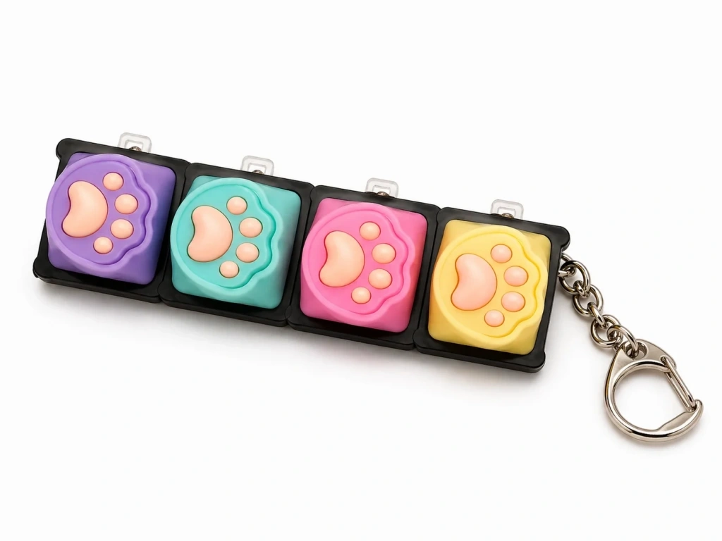 Işıklı Klavye Pati, hem dikkat çekici tasarımı hem de tatmin edici tuş hissi ile günlük stresinizi azaltmaya yardımcı olan fonksiyonel bir aksesuardır. Pati formundaki renkli tuşları ve ışık efektleri sayesinde kullanıcıya hem görsel hem de dokunsal olarak keyifli bir deneyim sunar.