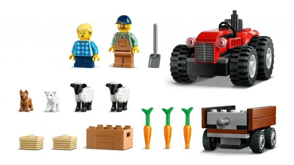 Kutuda ne var? – Bu çiftlik oyuncağı setinde, çocukların oyuncak bir traktör, römork ve 2 minifigür, ayrıca 2 koyun figürü, bir kuzu figürü ve bir köpek yavrusu figürü yapmak için ihtiyaçları olan her şey var