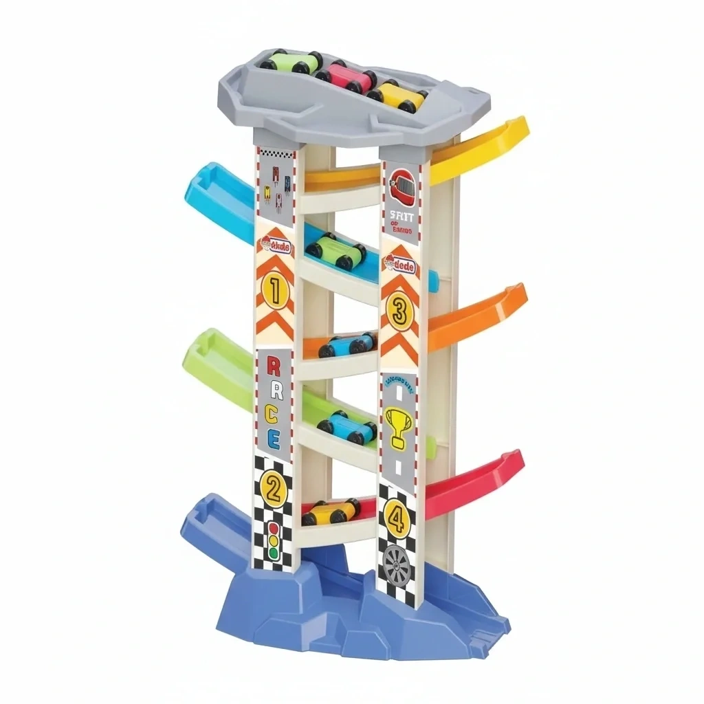 Renkli rampalar, arabaların yukarıdan aşağıya büyük bir hızla kaymasını sağlar. Her iniş, çocuklar için yeni bir heyecan ve keyifli bir oyun anı demektir.